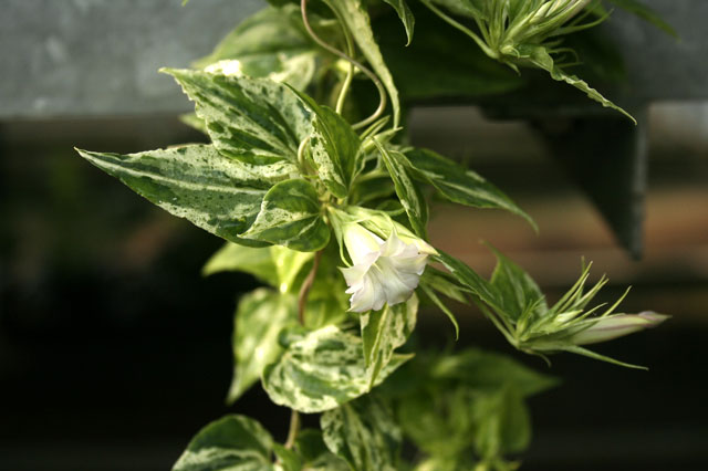 掃散斑ツルリンドウ 【059-002】 リンドウ 2019.10.26 雪白掃散斑の美麗葉選抜品種。行灯仕立てに向く。珍品。 開花期 7-9月 冬季 常緑 日当たり 明るい日陰 耐寒性 強 水やり 普通 施肥 春・秋に油粕肥料、生育時に有機液肥を2週間に1回程度 用土 山野草の土/基本培養土
