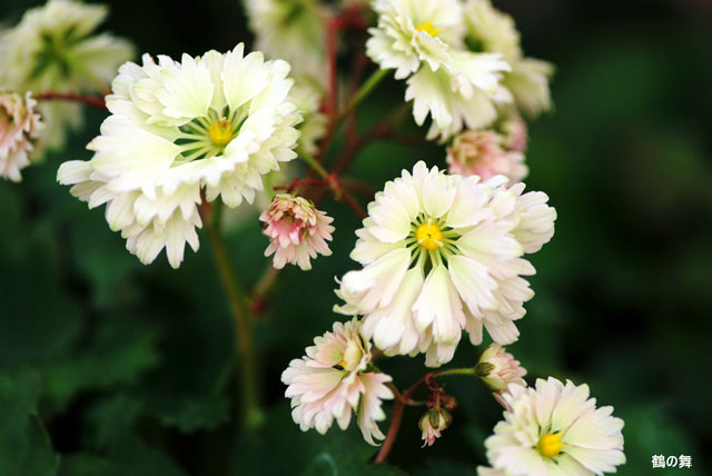 大文字草「鶴の舞」 【300-011】 大文字草 2019.11.04 ピンクから白に色味が変化するフギレ八重咲品種。 開花期 9-11月 冬季 落葉 日当たり 日陰 耐寒性 強 水やり 多め 施肥 春・秋に油粕肥料、生育時に有機液肥を2週間に1回程度 用土 山野草の土/基本培養土