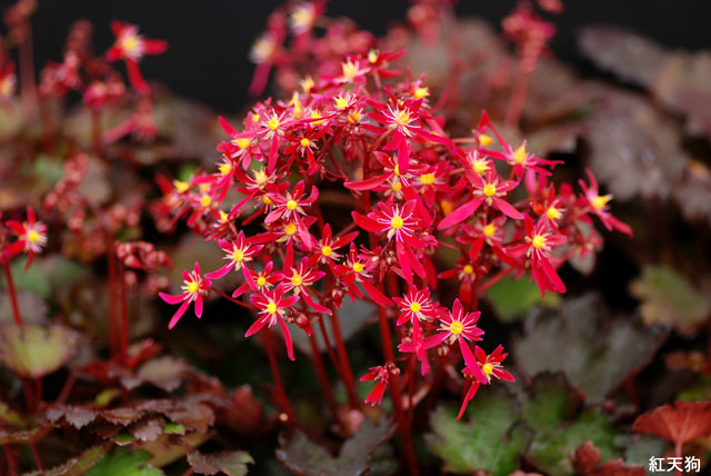 大文字草「紅天狗」 【300-017】 大文字草 2019.11.04 赤黒い葉に明るい濃赤の伸びやかな整形花。 開花期 9-11月 冬季 落葉 日当たり 日陰 耐寒性 強 水やり 多め 施肥 春・秋に油粕肥料、生育時に有機液肥を2週間に1回程度 用土 山野草の土/基本培養土