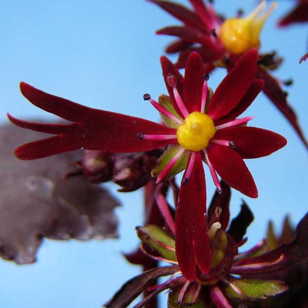大文字草「黒峰」 【300-101】 大文字草 2019.11.04 濃赤黒のフギレ細弁品種。 開花期 9-11月 冬季 落葉 日当たり 日陰 耐寒性 強 水やり 多め 施肥 春・秋に油粕肥料、生育時に有機液肥を2週間に1回程度 用土 山野草の土/基本培養土