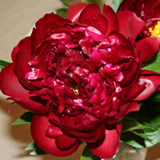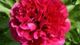 Paeonia x Lactifolia ‘Peter Brand’ 草丈90cm、オランダに古くから伝わる品種で、少なくとも1937年には記録がある。極大輪で非常に濃色の赤花八重品種で、満開時には黄色いシベを覗かせる。内弁はやや切れ込みがあり、時にカールして面白い花容を見せてくれる。葉は緑が濃く、茎も強いため切花としても人気が高い。また、秋の紅葉も美しく、花時期、秋、共に庭の主役としてふさわしい。生産量が非常に少なく、入手が困難な人気品種。ラクティフォリア系