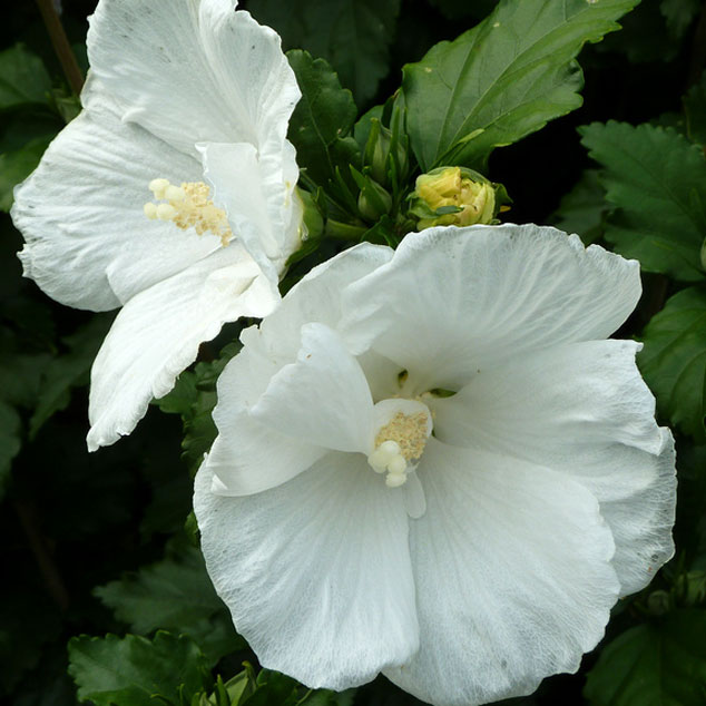 ムクゲ「ダイアナ」 【402-008】 アオイ 2019.10.26 清楚な純白の花。 開花期 7-9月 冬季 落葉 日当たり 日向 耐寒性 強 水やり 普通 施肥 春・秋に油粕肥料、生育時に有機液肥を2週間に1回程度 用土 基本培養土/山野草の土