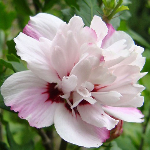 ムクゲ「レディ・スタンレイ」 【402-011】 アオイ 2019.10.26 純白に赤芯の半八重咲品種。 開花期 7-9月 冬季 落葉 日当たり 日向 耐寒性 強 水やり 普通 施肥 春・秋に油粕肥料、生育時に有機液肥を2週間に1回程度 用土 基本培養土/山野草の土