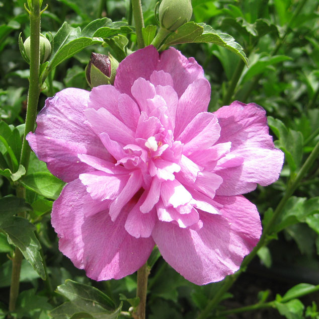 ムクゲ「パープル・ラッフル」 【402-014】 アオイ 2019.10.26 桃赤紫の八重咲品種。 開花期 7-9月 冬季 落葉 日当たり 日向 耐寒性 強 水やり 普通 施肥 春・秋に油粕肥料、生育時に有機液肥を2週間に1回程度 用土 基本培養土/山野草の土