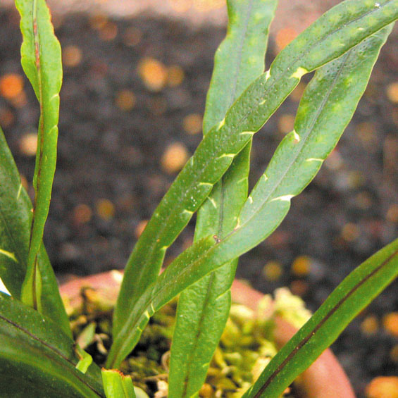 ノキシノブ「春雪」 【604-003】 ウラボシ 2019.10.26 ノキシノブには珍しい雪白掃込の本斑品種。流通量少なく珍品と言えるが増殖により少量ながらご提供。 開花期 冬季 常緑 日当たり 日陰 耐寒性 強 水やり 普通 施肥 生育期に有機液肥を2週間に1回程度 用土 基本培養土/ミズゴケ