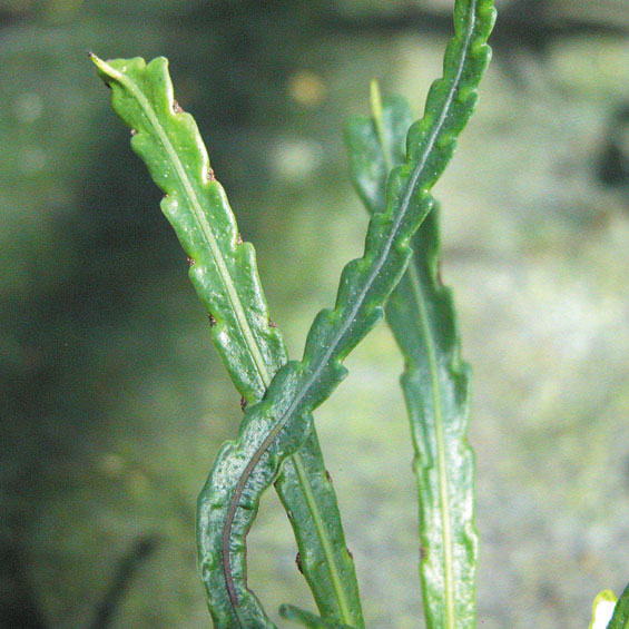 ノキシノブ「鋸葉鈴虫剣」 【604-020】 ウラボシ 2019.10.26 ノコギリ状の羽衣芸に鈴虫剣の珍品。 開花期 冬季 常緑 日当たり 日陰 耐寒性 強 水やり 普通 施肥 生育期に有機液肥を2週間に1回程度 用土 基本培養土/ミズゴケ
