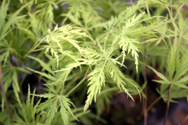 モミジ「ビリディス」 【692-007】 カエデ 2019.10.26 切れ込みが深くレース細工のような繊細な緑葉品種。 開花期 4-6月 冬季 落葉 日当たり 日向 耐寒性 強 水やり 普通 施肥 春・秋に油粕肥料、生育時に有機液肥を2週間に1回程度 用土 基本培養土/山野草の土