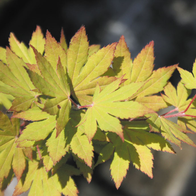 モミジ「葛城山」 【692-060】 カエデ 2019.10.26 黄緑色に爪紅の良い葉型の品種。 開花期 4-6月 冬季 落葉 日当たり 日向 耐寒性 強 水やり 普通 施肥 春・秋に油粕肥料、生育時に有機液肥を2週間に1回程度 用土 基本培養土/山野草の土