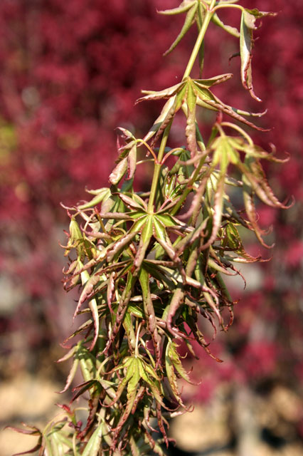 モミジ「狂獅子」 【692-062】 カエデ 2019.10.26 巻き葉で枝まで撚れる。秋葉は黄色。 開花期 4-6月 冬季 落葉 日当たり 日向 耐寒性 強 水やり 普通 施肥 春・秋に油粕肥料、生育時に有機液肥を2週間に1回程度 用土 基本培養土/山野草の土