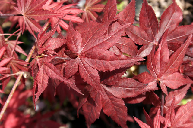 モミジ「ルビー・リッジ」 【692-113】 カエデ 2019.10.26 濃赤紫に赤い葉脈が浮き出る。 開花期 4-6月 冬季 落葉 日当たり 日向 耐寒性 強 水やり 普通 施肥 春・秋に油粕肥料、生育時に有機液肥を2週間に1回程度 用土 基本培養土/山野草の土