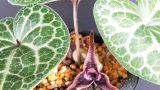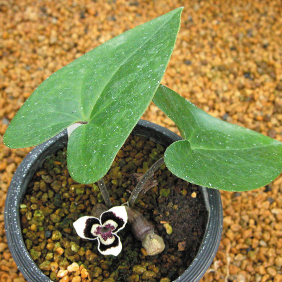中国裏毛カンアオイ 【702-028】 ウマノスズクサ 2019.10.26 白黒ツートンの花で葉の裏に細毛が密生する。 開花期 4-6月 冬季 常緑 日当たり 日陰 耐寒性 強 水やり 普通 施肥 春・秋に油粕肥料、生育時に有機液肥を2週間に1回程度 用土 山野草の土/基本培養土