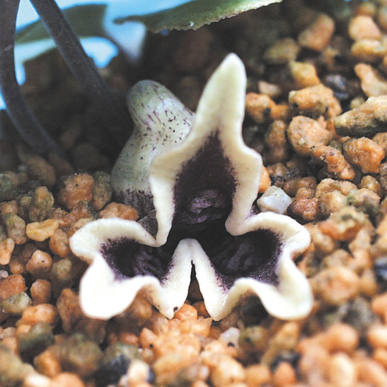 ホシザキ「沙羅」 【737-006】 ウマノスズクサ 2019.10.26 雪白覆輪整形花。純白に近い白覆輪と黒芯とのコントラストがすばらしい。 開花期 4-6月 冬季 常緑 日当たり 日陰 耐寒性 強 水やり 普通 施肥 春・秋に油粕肥料、生育期に有機液肥を2週間に1回程度 用土 山野草の土/基本培養土