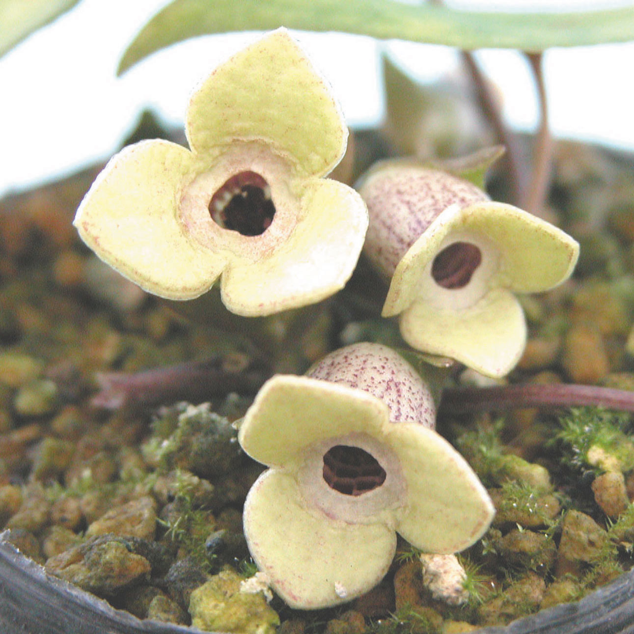 ウマノスズクサ黄地合桃芯赤霧点花。白みがかった黄花に萼筒、口辺部を中心に赤霧点が入る。変わった色合いの銘花。