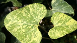 ウマノスズクサ 散斑大葉ウマノスズクサ 【009-003】 白黄散斑の選抜品種。丸葉で大型となる。開花期 3-6月 冬季 日当たり 明るい日陰 耐寒性 強 水やり 普通 施肥 春・秋に油粕肥料、生育時に有機液肥を2週間に1回程度 用土 山野草の土/基本培養土 2019.10.26 ウマノスズクサ