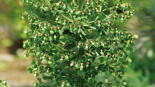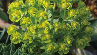 Euphorbia char. 'Purple and Gold' 草丈70cm、新芽と低温期は銅葉に染まり、春に黄色の花をつけてコントラストが美しい。切花にも向く。開花期 4-6月 冬季 常緑 日当たり 日向 耐寒性 強 水やり 少なめ ...