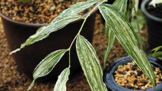 笹葉で大型の白散縞人気品種。開花期 4-6月 冬季 落葉 日当たり 明るい日陰 耐寒性 強 水やり 普通 施肥 春・秋に油粕肥料、生育時に有機液肥を2週間に1回程度 用土 山野草の土/基本培養土