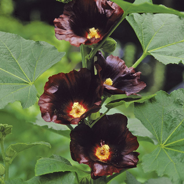 Alcea rosea Blacknight、草丈150㎝、濃黒紫色の花色が特徴。黄色い芯とのコントラストが美しい。