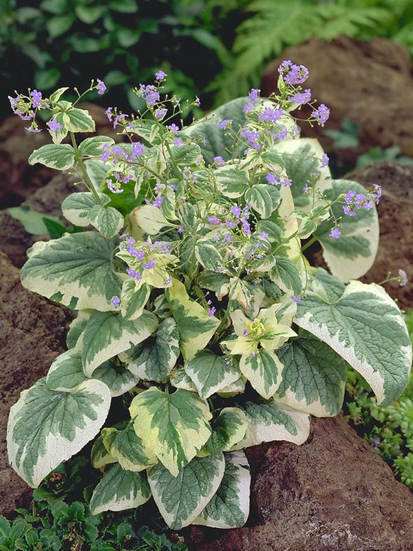 ムラサキBrunnera macro ‘Variegata’ 草丈30cm、くっきりとした覆輪斑でライラック色の繊細な花を咲かせる。