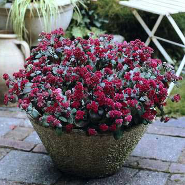 Sedum telephium ‘Red Cauli’ 草丈30cm、深い濃緑色の葉の上に濃赤色の花を咲かせるコンパクト品種。