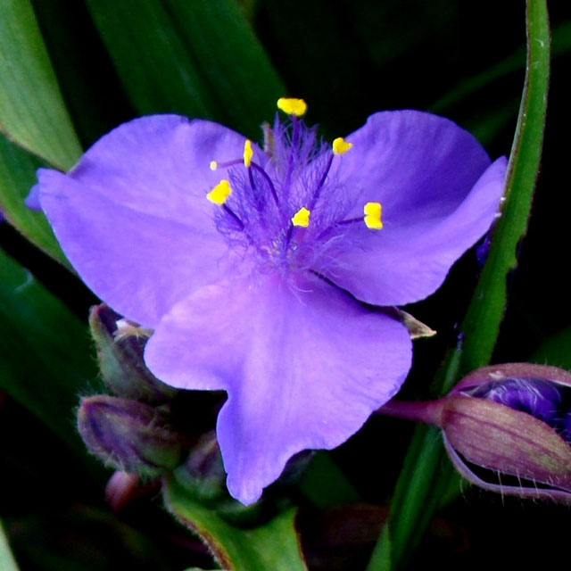 ツユクサTradescantia ‘Good Luck’ 草丈30cm、枝打つ草姿で花つきも良い鉢植え向き品種。