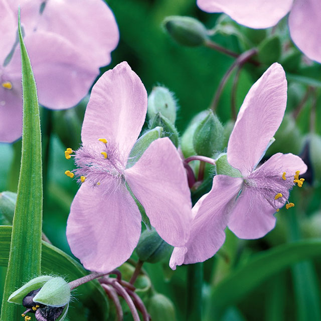 Tradescantia ‘Perrine’s Pink’ 草丈45cm、青みがかった濃緑の葉に可憐なピンク色の花を付ける。