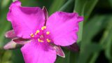 ツユクサTradescantia ‘Perrine’s Pink’ 草丈45cm、青みがかった濃緑の葉に可憐なピンク色の花を付ける。