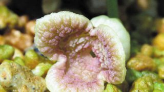 青軸系緑花で芯は桃色。フリルは弱くすっきりとした花形。開花期 4-6月 冬季 常緑 日当たり 日陰 耐寒性 強 水やり 普通 施肥 春・秋に油粕肥料、生育期に有機液肥を2週間に1回程度 用土 山野草の土/基本培養土