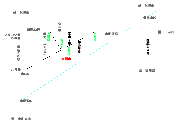 @お車で 松山自動車道、松山ICより約15分。国道33号、県道23号経由にて伊予市方面へ。伊予市内に入ってから2km程で左手に上野郵便局を過ぎ、最初の信号を斜め左方向へ(左手に緑色の当園看板有り)。左手に伊予小学校を過ぎ、右手に喫茶「案山子」を過ぎたらすぐに三叉路を左へ(看板有り)。住宅の影になっているのでご注意を。