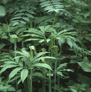 Arisaema serratum Number 25 50 100 500 1,000Zones 5-9 Fall 2003 US$163 US$300 US$550 N/A N/ATall, vigorous wide-spread Asian species with green or purplish- brown striped flowers held above two leaves with many leaflets. Sometimes more than 3' tall. Dependable, stately garden plant. Early to mid-season bloomer.