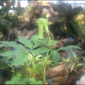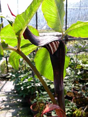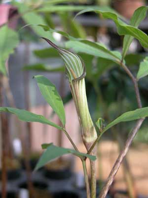Arisaema urashima Number 25 50 100 500 1,000Zones 5-9 Fall 2003 US$200 US$375 US$700 US$3,250 US$6,000Very similar overall to A. fhunbergii, but hardier, somewhat coarser in appearance, and often with broader leaflets. Easy and vigorous, good garden plant.