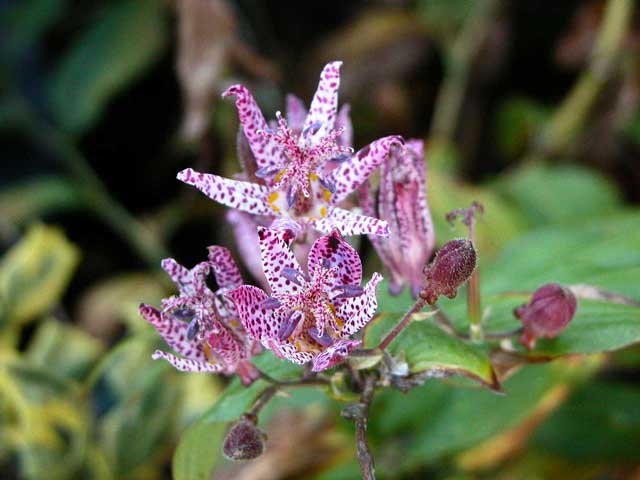 Japanese Tricyrtis hybrids with creamy-yellow and purple spots.