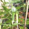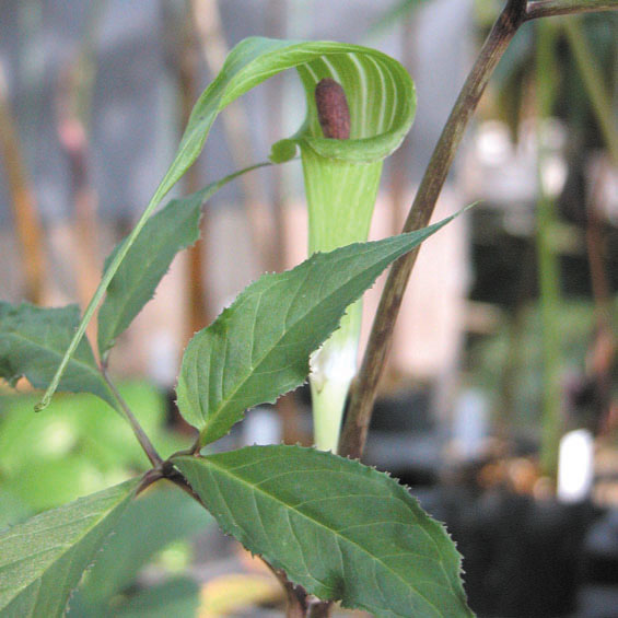 Elegant Japanese species from the mountains of Kyushu. The tall stem bears 1 leaf with about 10 leaflets. The flowers are striped green or purple with white inside, with a threadlike extension on the spathe. Mid season, excellent garden plant.