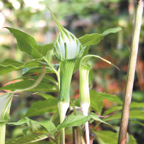 Striking species from central Japan to 3' tall. The stem is boldly mottled in a snakeskin pattern. The flower is pale green with white stripes, with an erect hood, white inside. Early to mid-season. @