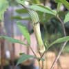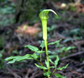 Tall, vigorous East Asian species to 3' called "dancing crane" in Japanese, which it resembles. There is one leaf with a least 15 leaflets, with a green flower held high above the leaf. The spathe is green, with a very long, yellow, whip-like spadix that arches up and descends. Easy.