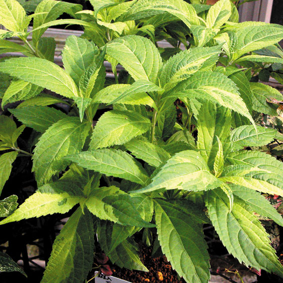 A wild and crazy variant of a choice fall blooming perennial. The yellow-splashed foliage harmonizes with the pale yellow flower spikes and adds interest when the plant is not in bloom. Woodsy soil in light to medium shade; not drought tolerant.