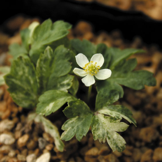 White variegated form of Jpanese woodland wildflower with white flowers and dissected leaves, creeping to form extensive colonies. Later than most spring anemones. Easy and vigorous.