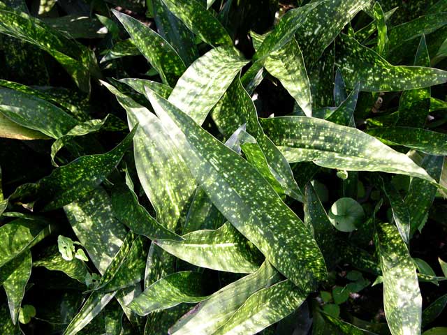 It is very large, to 3' or more, with relatively broad leaves, sparingly but uniformly covered with tiny white spots. One of the heartiest selections. Name means "starry sky".