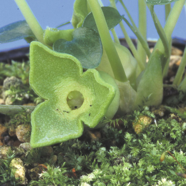 Very rare albino mutation of Podophyllum pleiantha. Green-white flower is very unusual, but beautiful clear color.