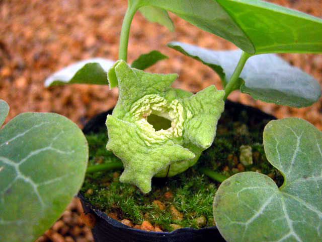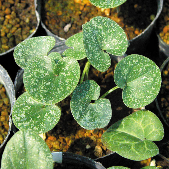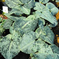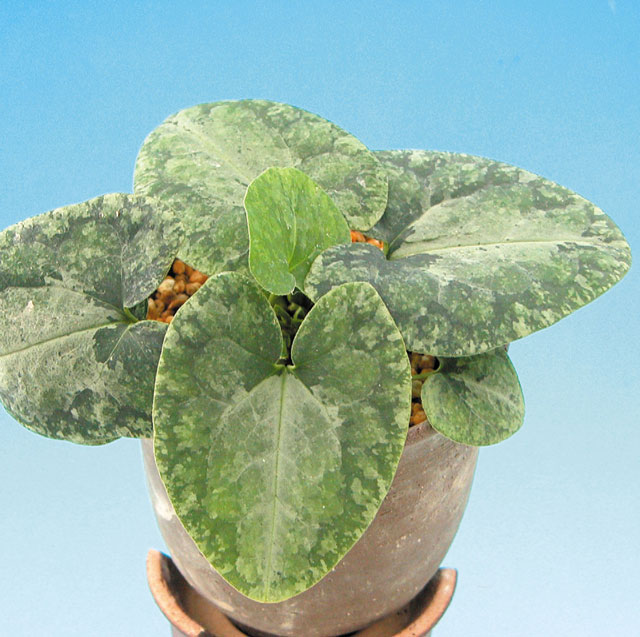 Medium green leaves mottled with dark green and silver; pale green flowers. Name means "snow moon flower."