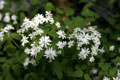 Dwarf tufted Japanese perennial with starry white flowers in July..