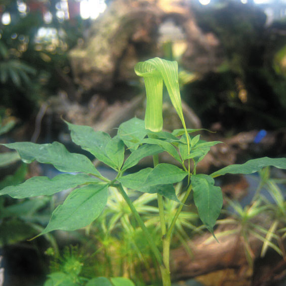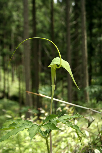 Tall, vigorous East Asian species to 3' called "dancing crane" in Japanese, which it resembles. There is one leaf with a least 15 leaflets, with a green flower held high above the leaf. The spathe is green, with a very long, yellow, whip-like spadix that arches up and descends. Easy.