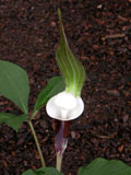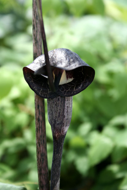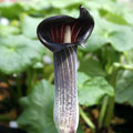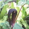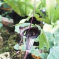Charming species with a single leaf to I' tall, with 7-13 leaflets. The flower is held on a short stalk. The spathe is dark purple with white markings inside. The spadix is tail-like and more than 5" long. " Like a mouse doing the rumba," says Maggie Wyche. Late spring bloomer.