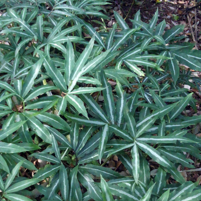 Northern Japanese species with wide-ranging rhizomes and glossy 3" long evergreen leaves, dark green or patterned. Forms a beautiful groundcover in loose, humusy soil. Large, bell- shaped nearly black flowers in fall. Excellent garden plant.