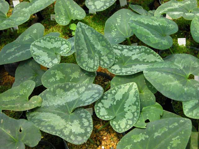 Clump-forming evergreen species from central Japan with leaves to 3" long, marked with a variety of beautiful patterns. Curious "Dutchman's pipe" flowers in spring. Often seen in Kyoto temple gardens. Good garden plant.