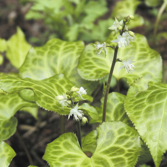 Chinese rare woodland perennial, white flowers and shiny patterned leaves.