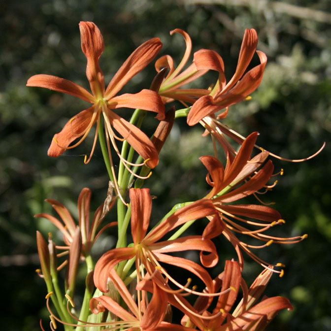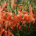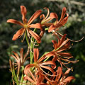 Neglected but beautiful August-blooming bulb from Japan with clusters of showy orange flowers, with longer more spidery tepals than sanguinea. Leaves appear in spring, disappear before bloom. Moist well-drained soil in shade or-sun.