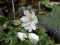 Japanese woodland Oxalis with green, rough-textured leaves and up-facing fully double white flowers. Easy in woodsy soil in shade.