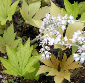 Coptis japonica var. dissecta Number 25 50 100 500 1,000Zones 5-8 Fall 2003 US$113 US$200 US$350 US$1,500 US$2,500Diminutive evergreen woodland perennial with fern-like leaves and tiny white starry flowers on dark stems, in early spring. Unique small-scale non-invasive groundcover. Evergreen parsley for shade. Reddish pinwheels of seed pods add summer interest.