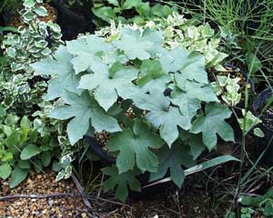 Cacalia delphinifolia Number 25 50 100 500 1,000Zones 4-8 Fall 2003 US$113 US$200 US$350 US$1,500 US$2,500Another under-appreciated shade plant from Japan with beautiful shiny maple-shaped leaves. The mound of foliage is topped by a 3' tower of frizzy white flowers in August. Nice contrast with hostas and ferns.