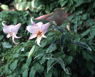 Lilium japonicum f. albomarginatum Number 25 50 100 500 1,000Zones 5-8 Fall 2003 US$263 US$500 US$950 US$4,500 N/AExtremely rare woodland lily with elegant pale pink trumpet flowers in June. This wild form from Shikoku has leaves with frosted white edges. Moist, well-drained soil in light shade, excellent rock garden plant. Very fragrant.
